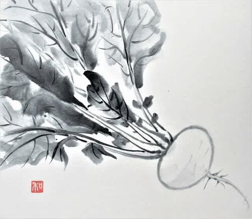 本画仙 色紙 蕪を水墨画で描きました。 今収穫しているのは小カブですが、それより少し大きめの蕪をイメージしてみました。これまでも蕪は描いていますが、何度描いても難しい。複数個の方が構図のバランスはとりやすいけれど、今回は敢えて1個だけの蕪を描…