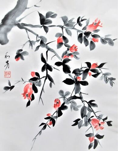 画仙紙 半切1/3 古木のザクロの花を墨彩画で描きました。 我が家のザクロは樹齢130年以上の古木のため近年は花の着きや葉の茂りもよくありませんが、今年は久しぶりに比較的良さそうです。花の着きに偏りはあるものの部分的には密に着いているところが…