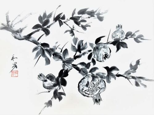 画仙紙 半切1/3 我が家の庭の主とも言える古木のザクロ。子供の頃には沢山成り、木によじ登り採ったものです。ザクロの実は非常に酸っぱいですが、完全に熟すと甘味も十分。ものがない時代、ムシャムシャとかじっては種の部分をペッと吐き出す。よくやっ…
