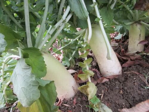 ダイコンとニンジンは12月20日過ぎに冬囲いをしています。今作のうち畑に残したものと冬囲いにしたものそれぞれ半数くらいにしました。これまでよりは畑に残す割合を少し多めにしています。こちらがダイコン。近年は大きくなりすぎる傾向があるので9月…