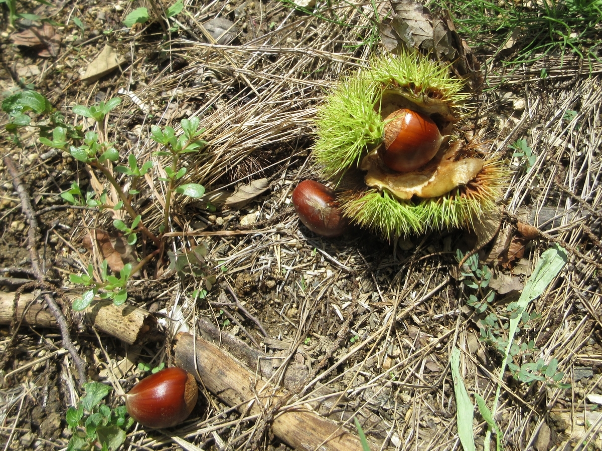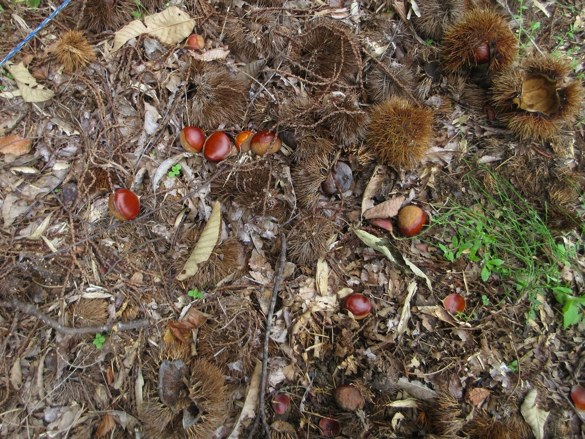 落ちているイガグリは沢山見えますが、色が黒いものは古いイガグリです。