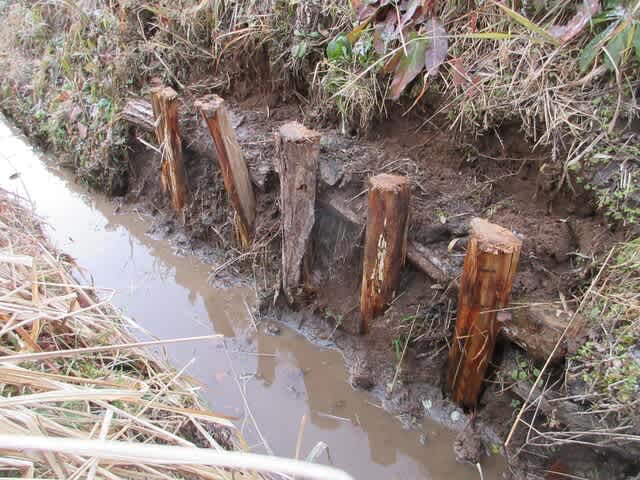 主な作業は土手や水路の崩落を防ぐために杭を打ち、土止めをすることです。