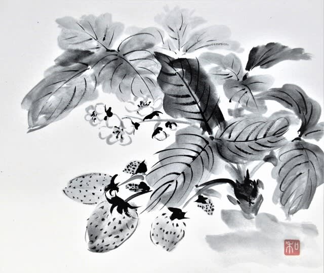 イチゴを水墨画で描きました。