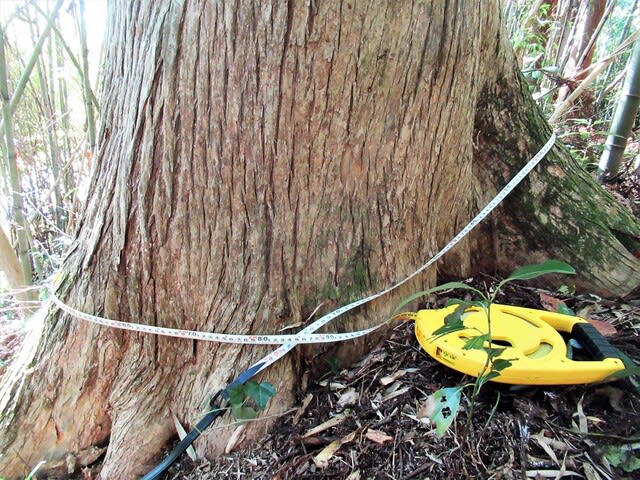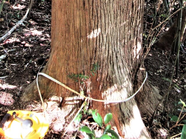 計測については、一人では困難なので、根元の大まかな計測です。一部は胸付近の幹周りも計りました。