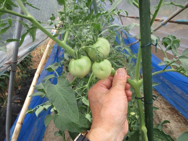 第1花房はすでに収穫は終わり過日2回目の捻枝をした第2基本枝が垂れています。