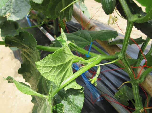 やはり夏秋キュウリでは子蔓、孫蔓と収穫の主体は側枝なので整枝は欠かせません。
